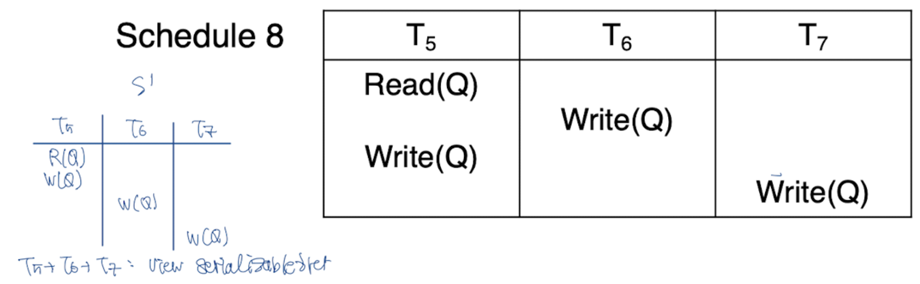 ์ด์ ๊ฐ์ด conflict serializable ํ์ง ์์ง๋ง view serializable ํ ์ค์ผ์ค์ ๋ชจ๋ blind writes ๋ฅผ ๊ฐ์ง๊ณ ์์.