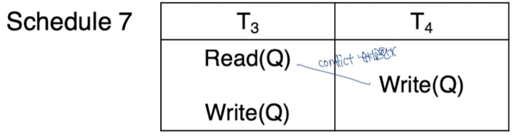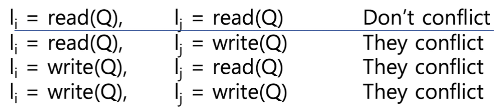 - Instructions and $I_j$ of transactions $T_i$ and $T_j$ respectively, conflict if and only if there exists some item Q accessed by both $I_i$ and $I_j$ , and at least one of these instructions is write(Q)