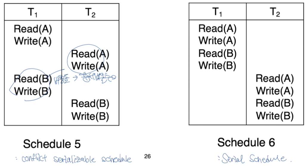 - We say that a schedule S is conflict serializable if it is conflict equivalent to a serial schedule