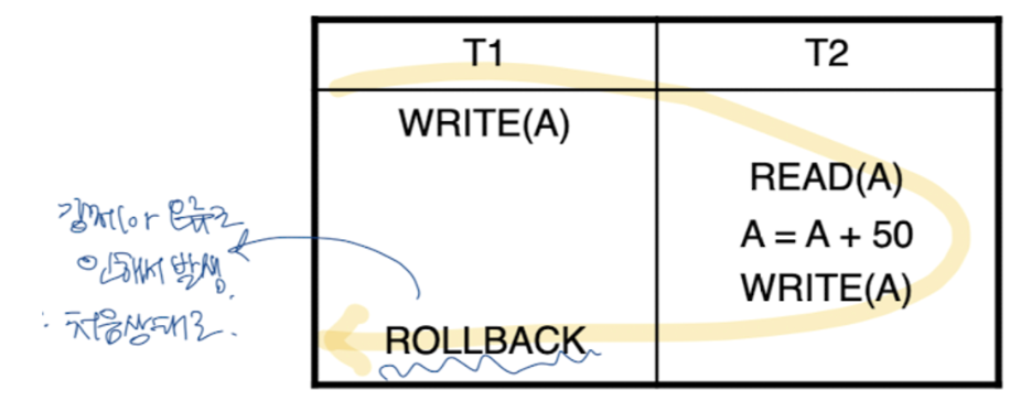 : Rollback์ผ๋ก ์ธํด A๋ ์ฒ์ ์ํ๋ก → T2์ A๋ ์๋ชป๋ ๊ฐ์ ์ฝ๊ณ ์๋ ๊ฒ์