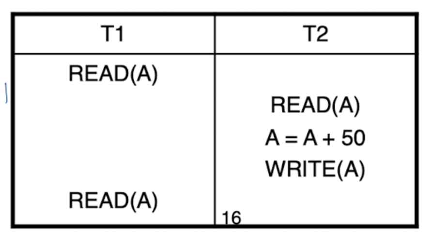 : ํ transaction์์ updateํ ๋ด์ฉ์ด ์์ผ๋ฉด readํ ๋ฐ์ดํฐ๊ฐ ๊ฐ์์ผ ํจ. ๊ทผ๋ฐ T2์ ์ฐ์ฐ์ผ๋ก ์ธํด T1์์ readํ ๋ฐ์ดํฐ๊ฐ ๋ณํจ